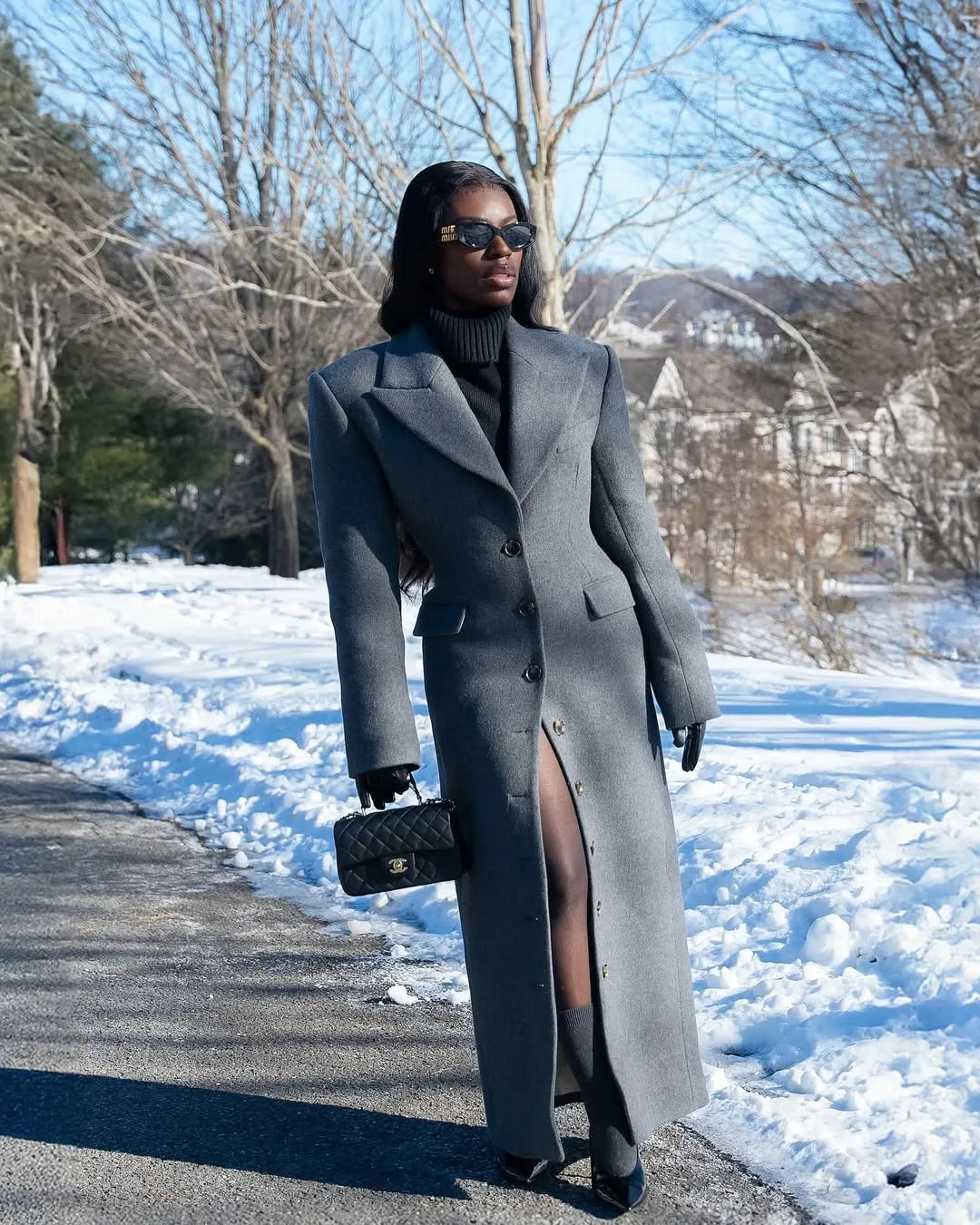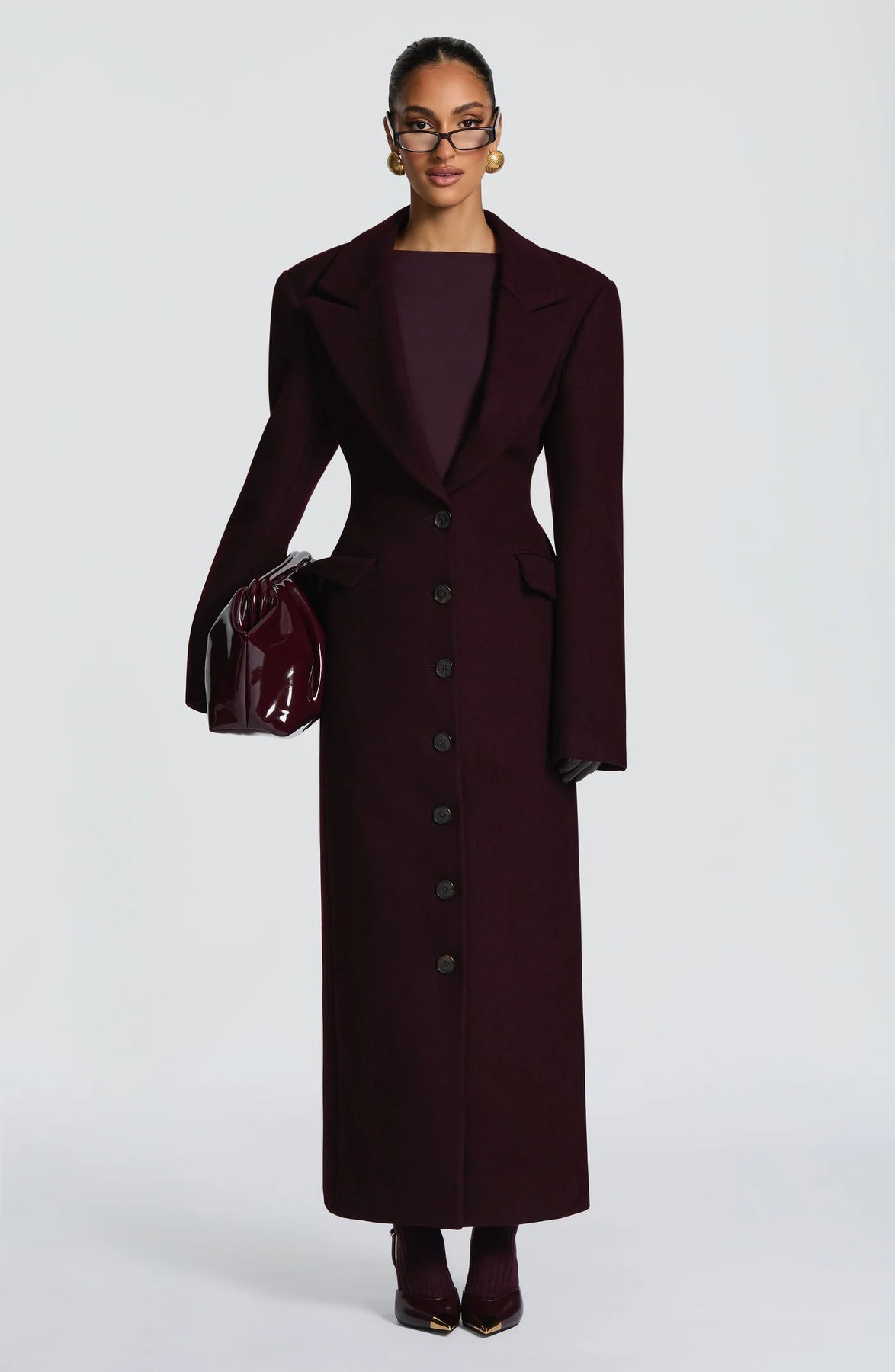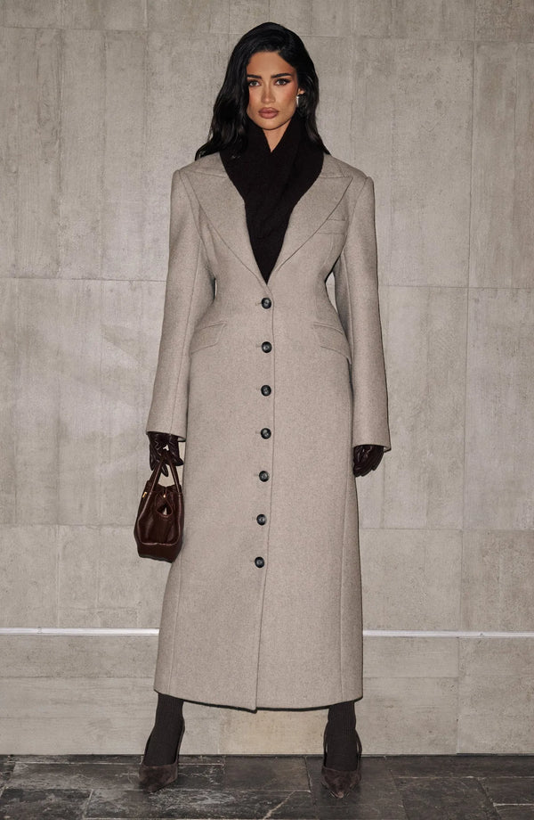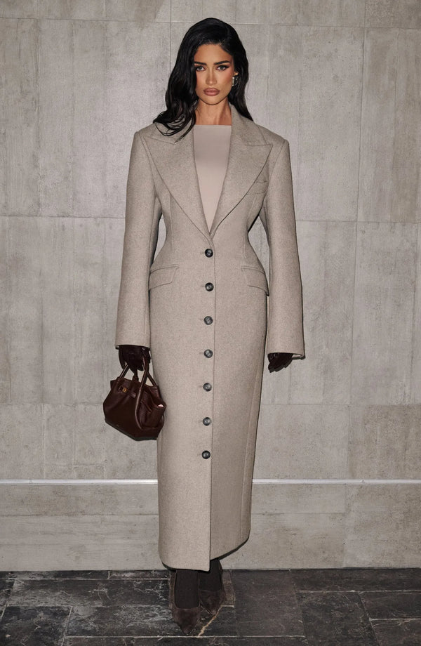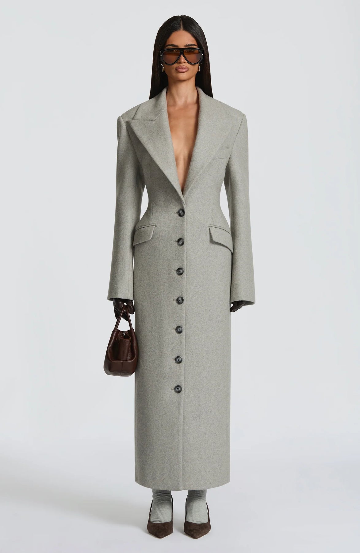 Sharp lines, tailored waist, and dramatic length – pure confidence in a coat.
